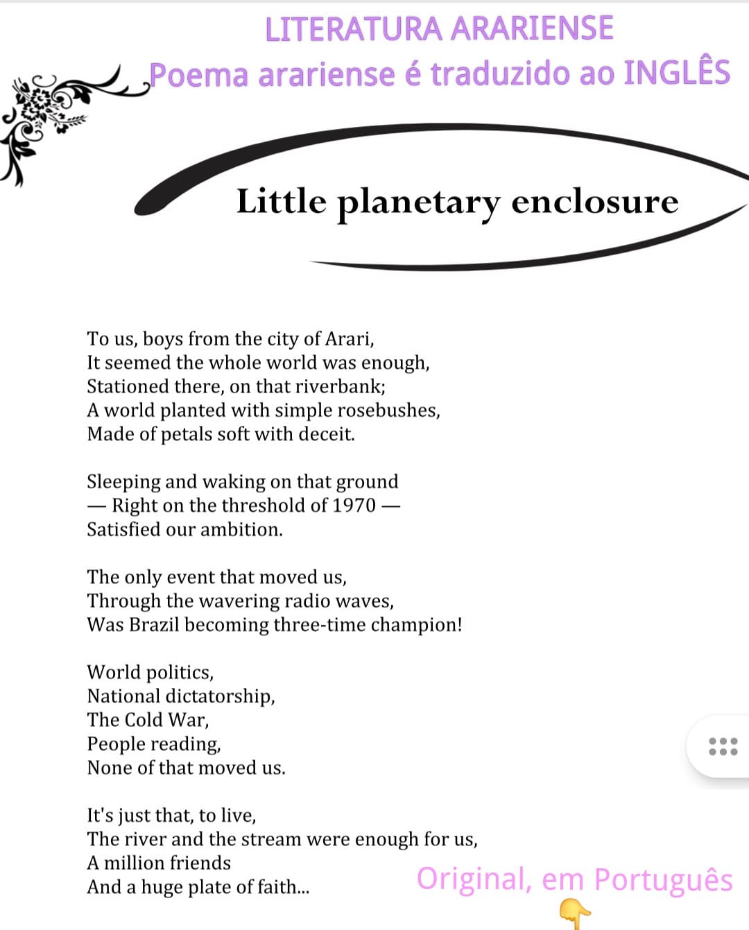 NO CAPÍTULO D’outras flores do meu vergel do livro Tertúlia Poética Com o Tempo e Arari em Mina Vida você encontrará texto que fala sobre a história da COTONNIÈRE/HOSPITAL DE ARARI, a primeira notícia de desvio de verba pública, em Arari, o Oito de Janeiro arariense, informações sobre o internato do padre Brandt etc etc.
