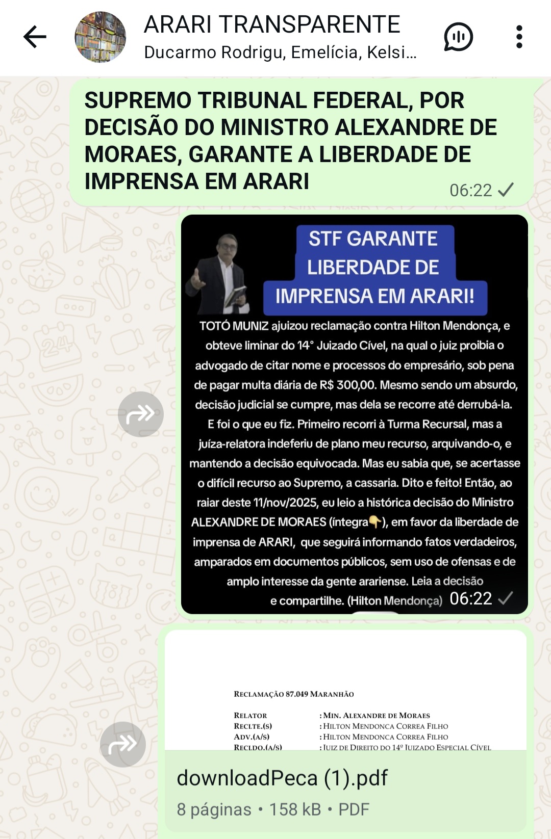 LIMINAR TERATOLÓGICA do juiz João Francisco Rocha, do 14º Juizado Especial Cível, IMPÔS A ODIOSA CENSURA PRÉVIA A POSTAGENS DE HILTON MENDONÇA, E O ADVOGADO CONSEGUIU CASSÁ-LA NO STF. Segue a sentença que JULGOU PROCEDENTE a reclamação constitucional, de nº 87.049.