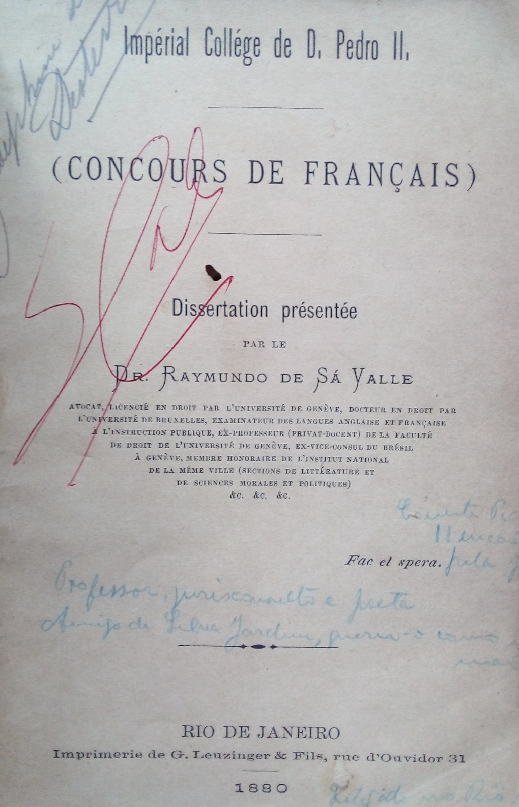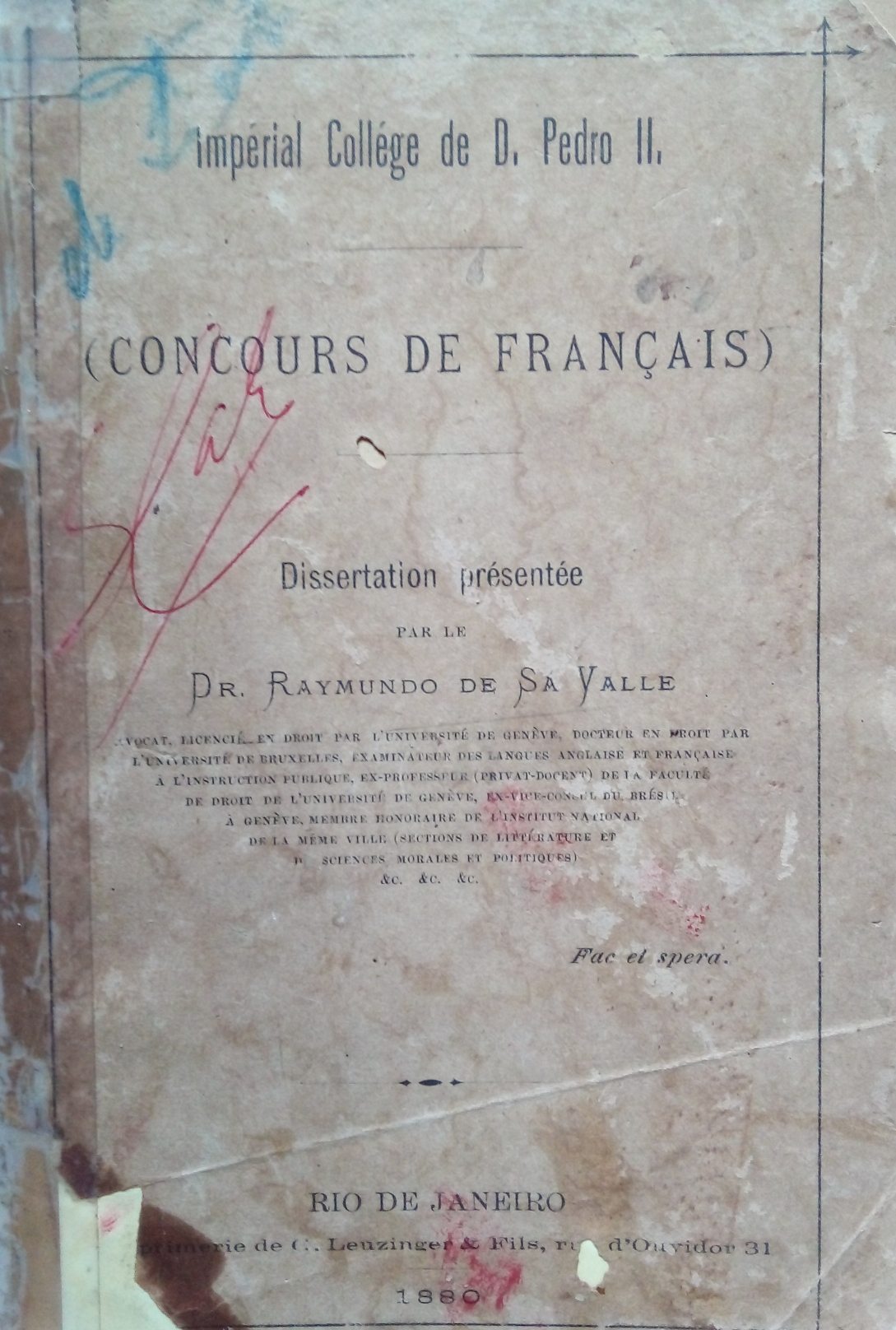 9)DR. RAYMUNDO DE SÁ VALLE – Edição de 1880Concurs de Français – Imperial Collége de D. Pedro II